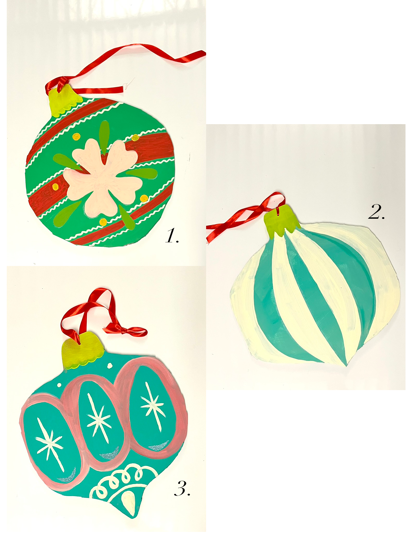 painted with Pamela Scharback, These oversize ornaments were made to be hung above and seen from a distance, they were cut from styrofoam and hand painted -- as such please expect some wobbly edges, texture in the paint strokes & some chalk under-drawing coming through. The pricing reflects this, so please dont anticipate a perfectly finished piece. The price would be much higher if that were the case