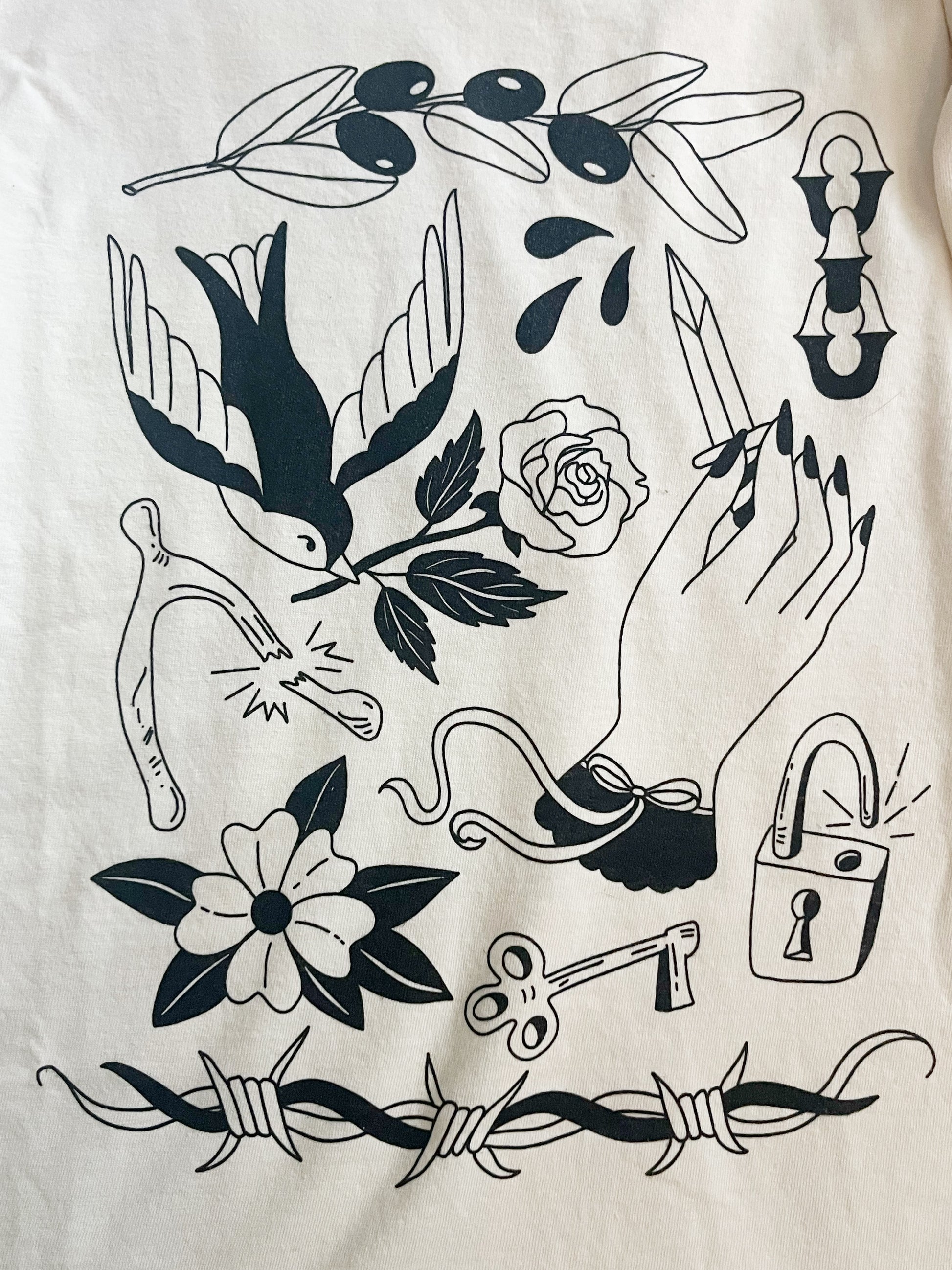 black ink on ivory long sleeve tee designed and screenprinted in london ontario by alayna hryclik unisex fit 100% cotton.