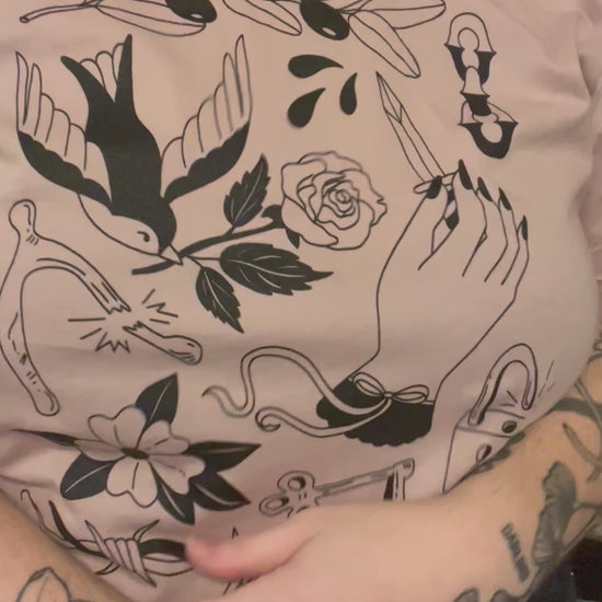 black ink on pink gravel tee designed, dyed and silkscreened in london ontario by alayna hryclik unisex fit 100% cotton.